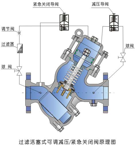 二、減壓緊急關(guān)閉閥特點: 1.減壓緊急關(guān)閉閥調(diào)整操作靈活方便,(壓力不超過設(shè)定值)調(diào)整范圍大,可靠. 2.減壓效果極佳,無論上游壓力及流量如何變化,而設(shè)定的下游壓力均衡定不變. 3.既可減動壓,又可以減靜壓. 4.Y形寬體閥腔,流阻小、抗汽蝕性強,無噪音. 5.緊急關(guān)閉導(dǎo)閥的調(diào)節(jié)靈活、方便、可靠. 6.本閥也可以單作緊急關(guān)閉閥用. 7.自帶過濾裝置及防震壓力表,使安裝尺寸縮短約40%,減少占用空間,節(jié)省投資成本. 8.內(nèi)外表面均噴涂環(huán)保涂層,確保產(chǎn)品的防腐蝕及安全性.